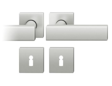 Eine Rosettengarnitur setzt sich aus zwei Drückerrosetten, zwei Drückern, zwei Schlüsselrosetten und einem Vierkantstift zusammen.